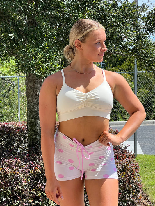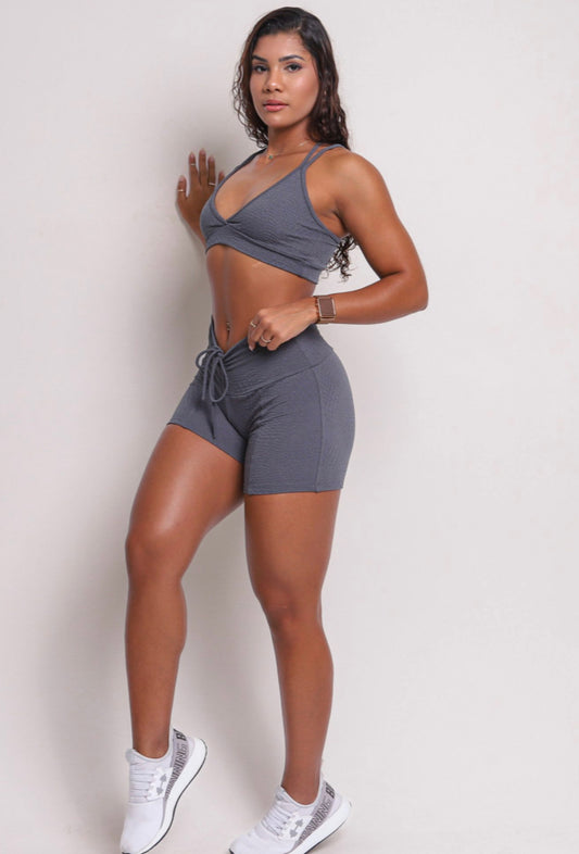 The high-rise shorts have butt-lifting sewing technology and a front drawstring.