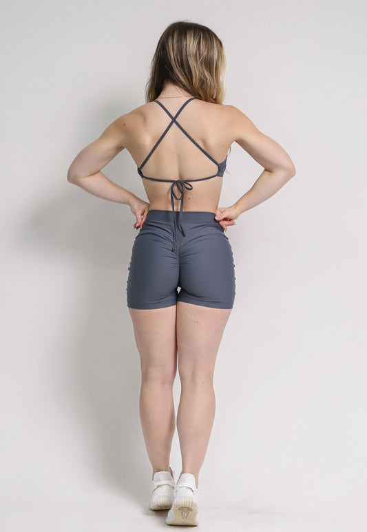 The high-rise shorts have butt-lifting sewing technology and a front drawstring.