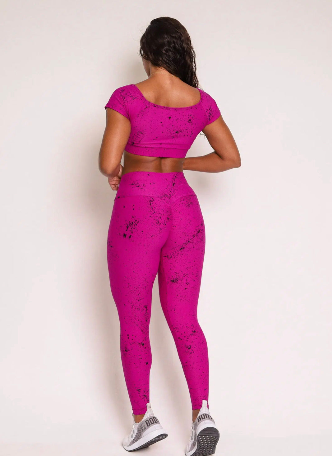 This set, made from bubble jacquard polyamide, guarantees elasticity, support and support. With its zero transparency material, it is ideal for high-impact exercises! The irregular powder print, or bubbles, finishes the design of these pieces with great style.