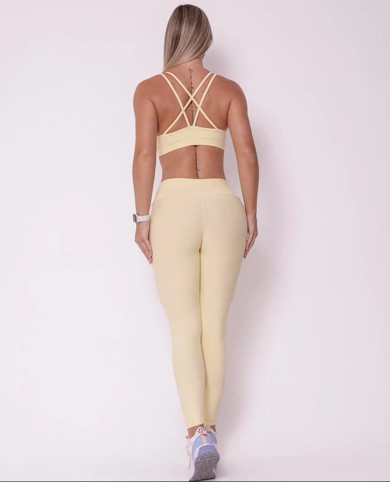 The basic leggings feature a straight waistband with no booty-enhancing seam or drawstring. The top is the same style shown in the photo.