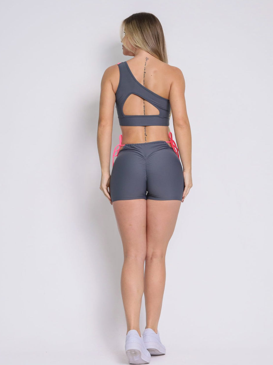 The fitted shorts have butt-lifting sewing technology and a drawstring on the side waistband, allowing for waist adjustment. The top is the same model as in the photo.
