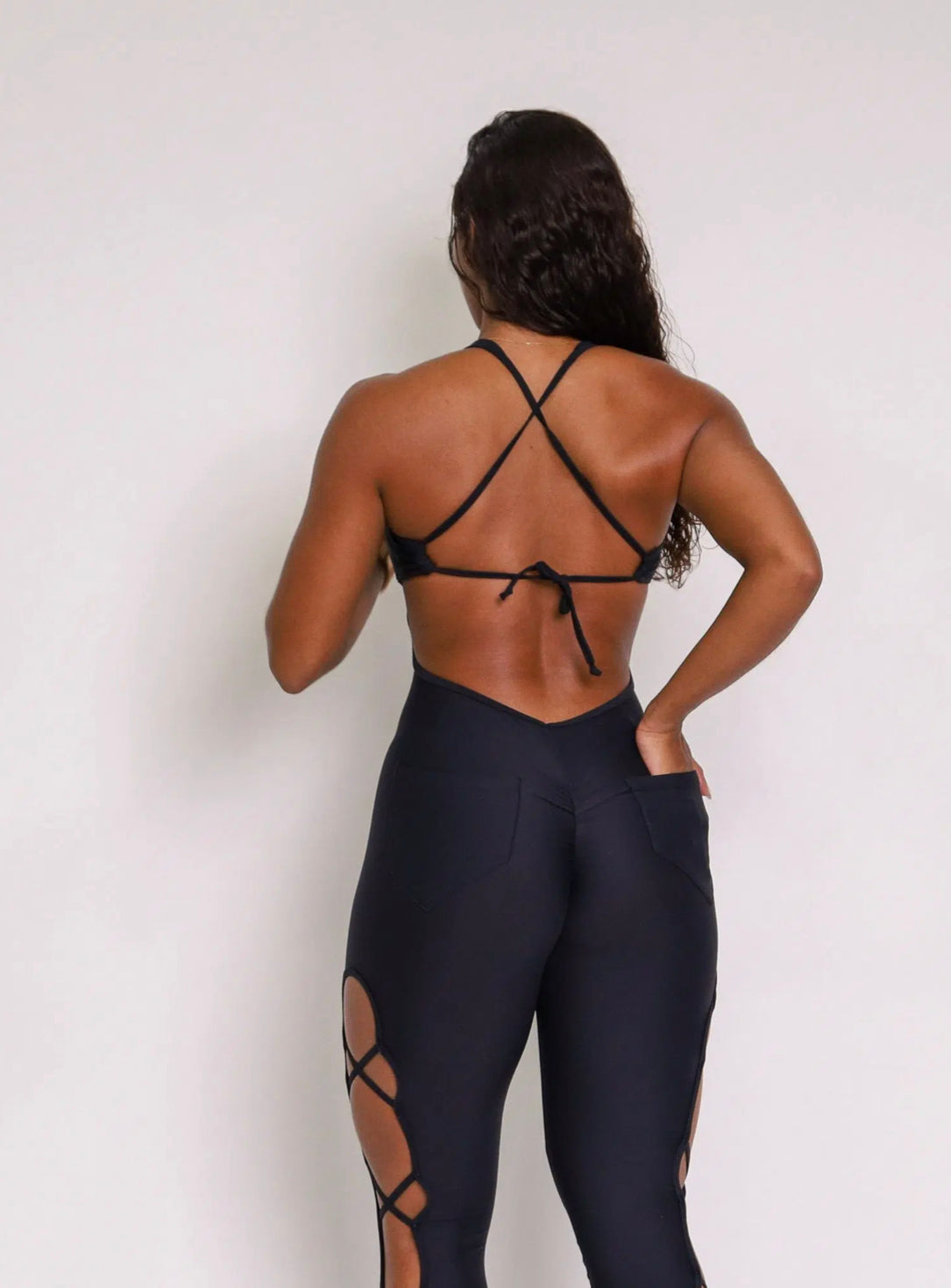 The jumpsuit has a scrunch butt . The cutouts throughout the piece enhance the body.