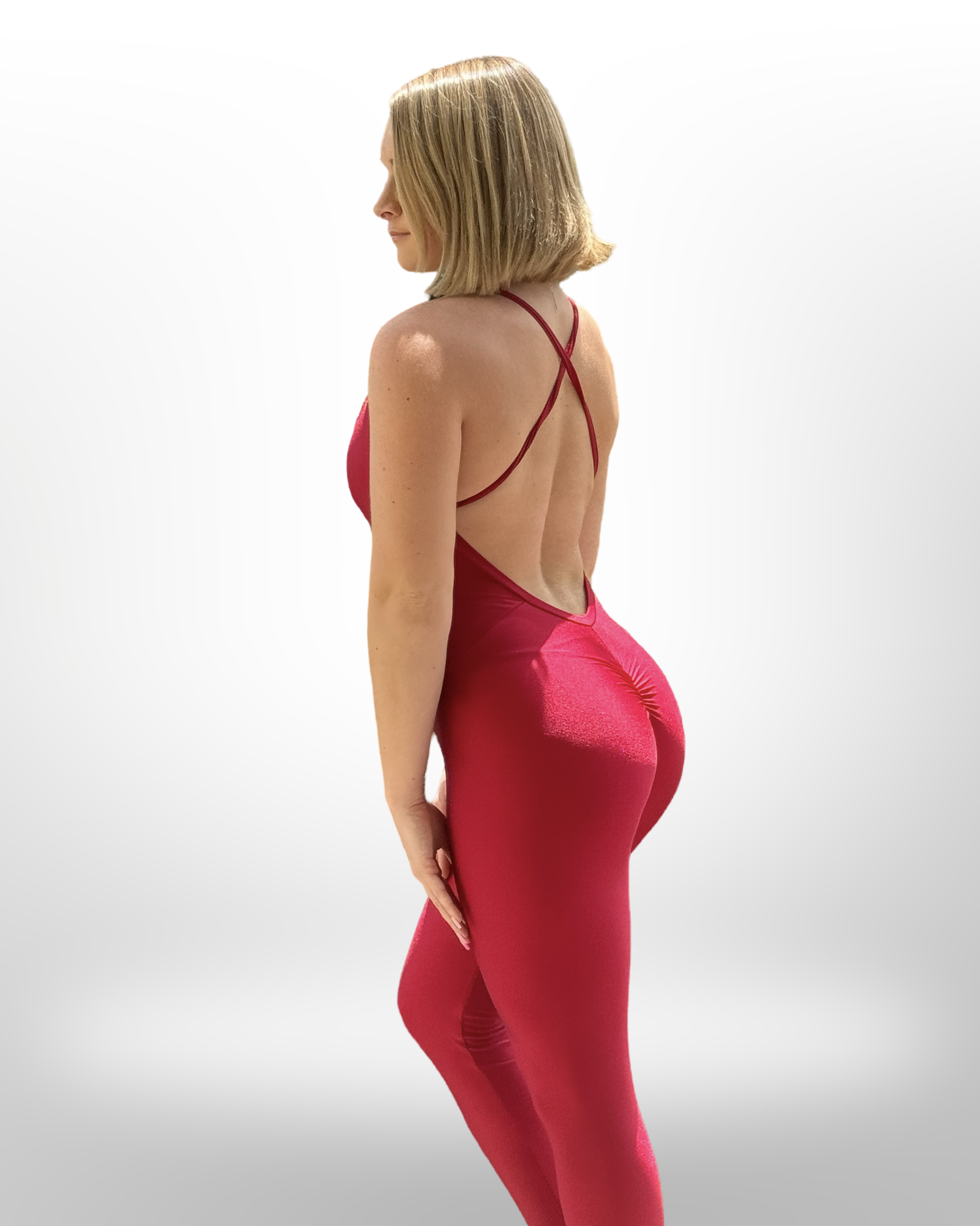 The jumpsuit has a raised butt . The front neckline has a strategic cut that enhances the body.